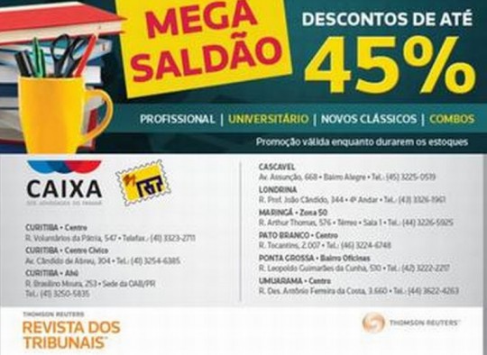 A livraria da Caixa de Assistência dos Advogados (CAA-PR) By RT está realizando um mega saldão de obras, coleções e best sellers com descontos de até 45%. As promoções são válidas até o dia 30 deste mês ou enquanto durarem os estoques em todas as lojas do estado e nas compras pela internet.